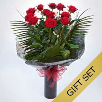 12 red roses hand tied with foliage, and a box of scrumptious Thornton's Chocolates, for that special someone. Prices vary according to the quality of the roses. Vase not included.